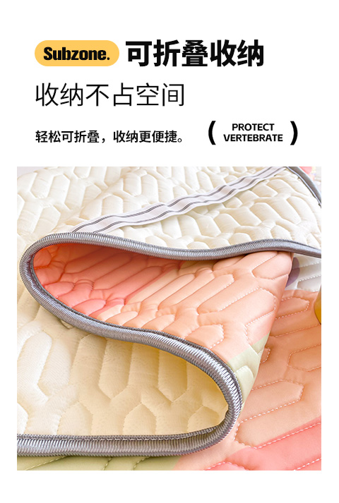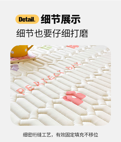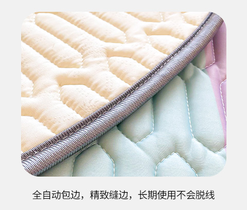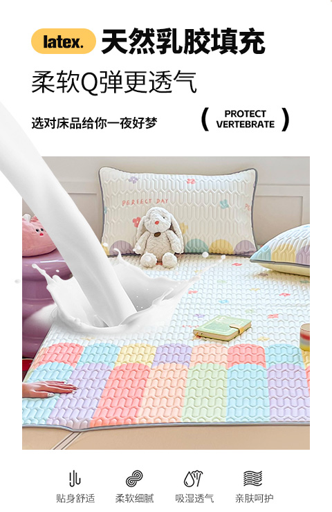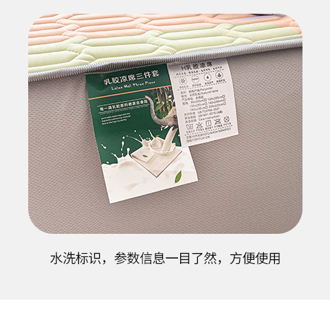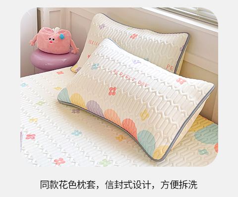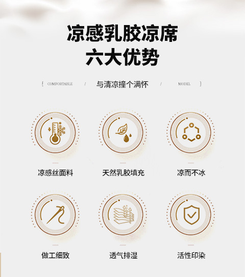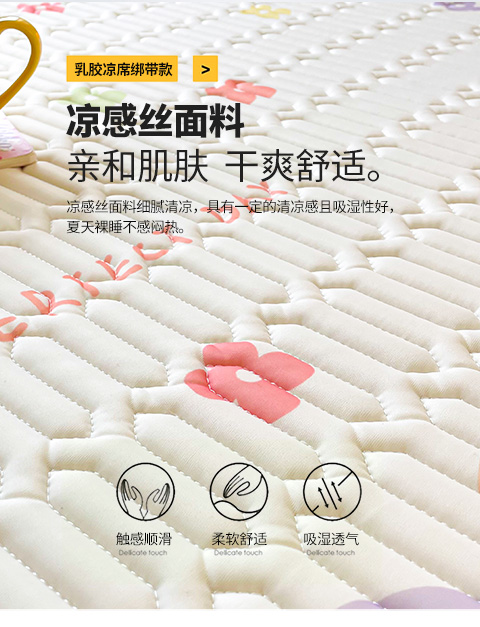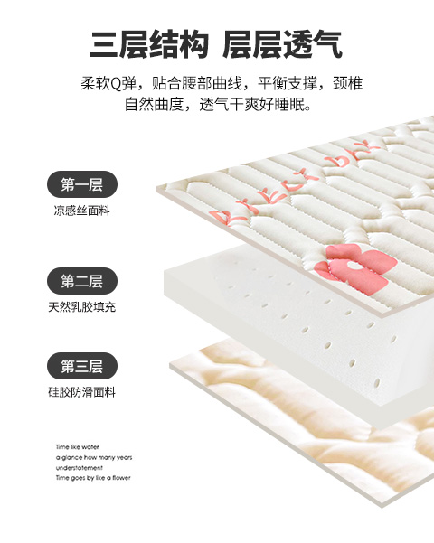 采取三层结构,层层透气,第一层凉感丝面料,第二层天然乳胶填充,第三层硅胶防滑面料,柔软舒适